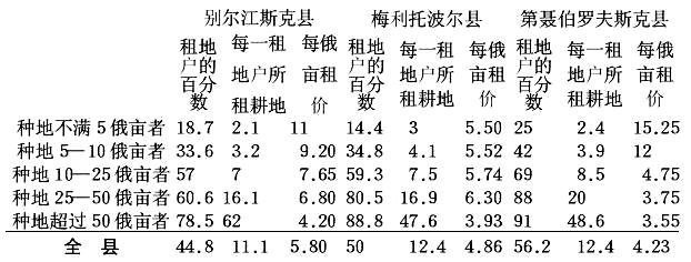 | 租 地 户数 | 租地面积(单位俄亩) | 每一租地户租地面积 | 租地户数 | 租地面积(单位俄亩) | 每一租地户租地面积 | 租地户数 | 租地面积(单位俄亩) | 每一租地户租地面积 | 租地户数 | 租地面积(单位俄亩) | 百分比 | 每一租地户租地面积 | |