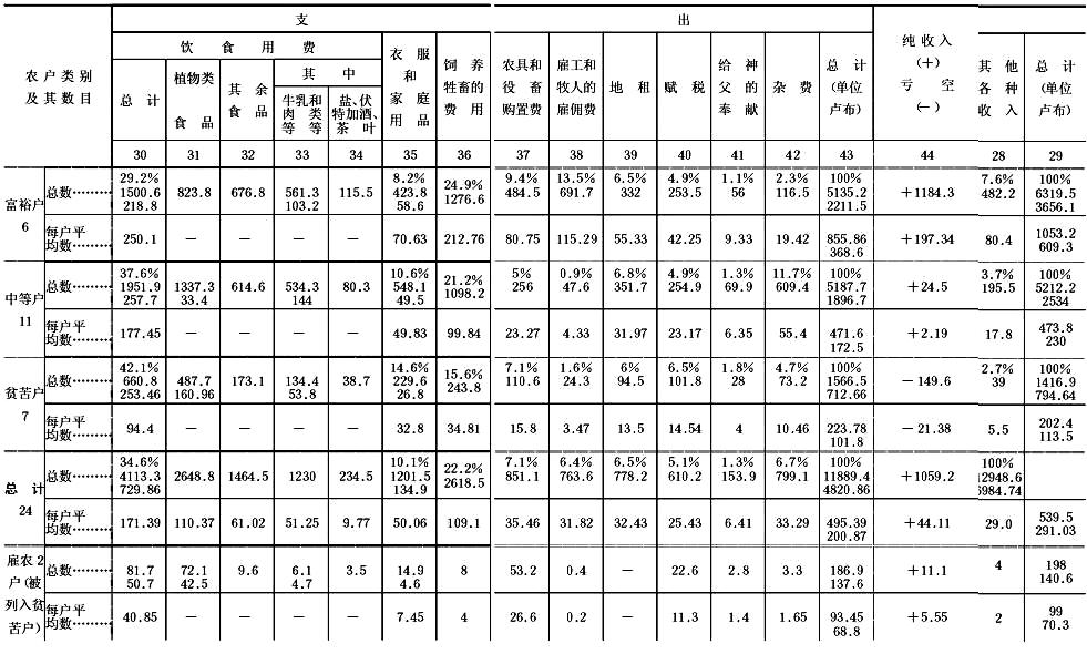 至于贫苦农民,他们经营农业简直是亏本;“副业”的作用在他们的家庭收支中更大(占收入的24%),并且这些副业几乎完全(只有一户除外)是出卖劳动力。其中有两户以“副业”(当雇农)为主,占收入的2/3。
