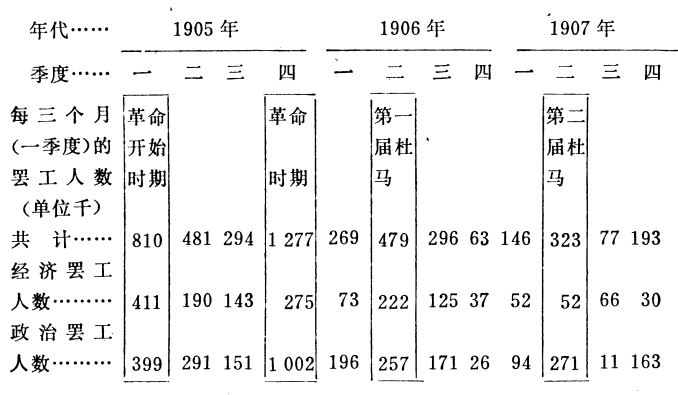 每年平均罢工人数 第一时期(1895—1904年),革命前时期 43000 第二时期(1905—1907年),革命时期 1570000 第三时期(1908—1910年),反革命时期 96000 第四时期(1911—1912年),开始活跃的当前时期 394000 |