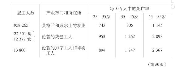 1860年和1861年卫生局调查了在室内经营的产业部门,这些部门的死亡统计表明:就同等数量的15岁到55岁的男子来说,如果在英国农业地区因肺结核和其他肺病引起的死亡数为100,在以下几个地方的死亡数是:考文垂死于肺结核的为163,布莱克本和斯基普顿167,康格尔顿和布拉德福德168,莱斯特171,利克182,麦克尔斯菲尔德184,博尔顿190,诺丁汉192,罗奇代尔193,德比198,索尔福德和阿什顿安德莱恩203,利兹218,普雷斯顿220,曼彻斯特263。(第24页)下表提供了一个更明显的例子。这个表按性别分别列出每10万个15岁到25岁的人中死于肺病的人数。表上所选择的是这样一些地区,那里只有妇女在室内经营的产业中工作,而男子却在各种劳动部门工作。