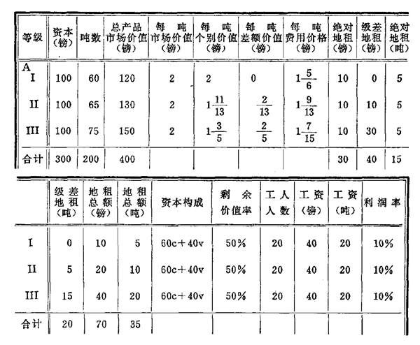 至于Ⅱ,这里产品的[实际]价值也等于120镑等等。但是因为每吨个别价值等于1+(11/13)镑(或24/13镑),所以这个等级生产65吨(因为120除以24/13等于65)。简单地说,我们在这里得到的是第574页上的A表。但是因为在这里我们需要有几个新项目来适应我们的目的,所以当出现Ⅰ这个等级而产品市场价值提高到2镑时,我们就要为这第三种场合制一个新表。