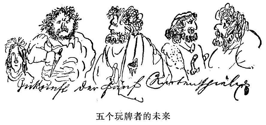 Et tu,Brute?Friderice Graeber,hoc est res quam nunquam de te crediderim!Tu jocas ad cartas?passionaliter?O Tempores,o moria!Res dignissima memoria!Unde est tua gloria?Wo ist Dein Ruhm und Dein Christentum?Est itum ad Diabolum!Quis est,qui te seduxit?Nonne verbum meum fruxit(hat gefruchtet)?O fili mi,verte,sonst schlag ich Dich mit Rute und Gerte,cartas abandona,fac multa bona,et vitam agas integram,partem recuperabis optimam!Vides amorem meum,ut spiritum faulenzendeum egi ad linguam latinam et dic obstupatus:quinam fecit Angelum ita tollum,nonsensitatis vollum,plenum et,plus ancora viel:hoc fecit enorme Kartenspiel!FN1自己好好想想吧,干坏事的人,想一想你生活的目的是什么!强盗,想一想你在各个方面都在犯罪,不知好歹!纸牌!这是用魔鬼的皮做的。啊,你们这些恶棍!一想到你们我就眼泪汪汪,或者说痛心疾首!哎呀,我身上充满了灵感啦!在1839年第二个月的第十九天,正午时分,因为通常十二点钟用午饭,一阵旋风将我卷起,带向远方,那里我看到他们正在玩牌,而这时正是吃午饭的时候。牌还得继续打下去。这时从东方刮起了一场可怕的雷暴雨,窗玻璃嘎嘎作响,冰雹纷纷落下,可是他们仍然继续玩牌。后来玩得争吵起来了。东方的国王杀向西方的大公,午夜里又是格斗者的一片厮杀声,接着大海的公爵又起来反对东方诸国,于是一场人类空前的大决战就在他的城市前面爆发了。然而,他们还是继续玩牌。终于从天上降下七个神灵。第一个神灵身穿长礼服,他的胡子垂到胸前。他们称他浮士德。第二个神灵的秃顶周围长着一圈白发,他扬言:“哀哉,哀哉,哀哉!”他们叫他李尔。第三个神灵是个高个子,力气很大,他的名字叫华伦斯坦。第四个神灵象亚衲族人的后裔,拿着一根黎巴嫩雪松般的大棒。他们叫他海格立斯。第五个神灵混身如铁打钢铸,他的名字写在他的前额上:齐格弗里特。和他并行的是个强壮的勇士,他的宝剑犹如闪电闪烁着光芒,这是第六个神灵,他叫罗兰。第七个神灵身佩宝剑,把系在剑梢上的头巾当作旗帜在头上挥舞,旗帜上写着:Mio CidFN2。这七个神灵敲了敲玩牌者的门,可是他们不予理睬。终于从午夜里走来了伟大的黎明,它象雄鹰一般掠过整个大地,飞向远方,当它消失的时候,我就再也看不到玩牌者了。但门上画了几个黑色的符号: