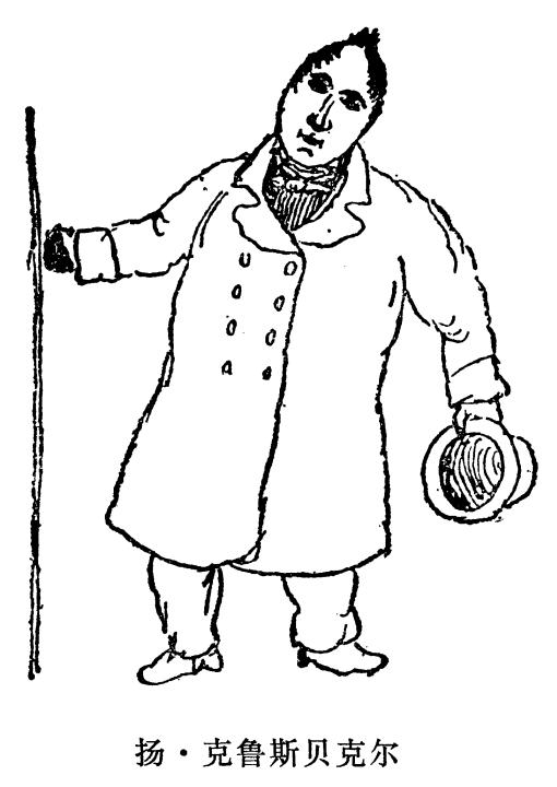 现在我每个星期天都要和理·罗特一起骑马远游。上星期一,我们到过费格萨克和布鲁门塔尔。正当我们想参观有名的不来梅的瑞士(面积很小、满是小沙丘的地段)时,突然升起一大片尘埃,象乌云一样。五分钟以后,几乎完全昏暗不明,因此我们根本不可能观赏所谓的美景。——不过,圣灵降临节的第二天,这个地方热闹极了。所有的人都到城外去,不来梅城里死一般的寂静,而城门外车水马龙,骑马的和走路的络绎不绝。然而尘土飞扬,令人生畏。因为公路上灰沙很多,几乎有半尺深,尘土自然会在空中弥漫。刚才进来一个经纪人,此人叫扬·克鲁斯贝克尔,我给你把他的像画下来。