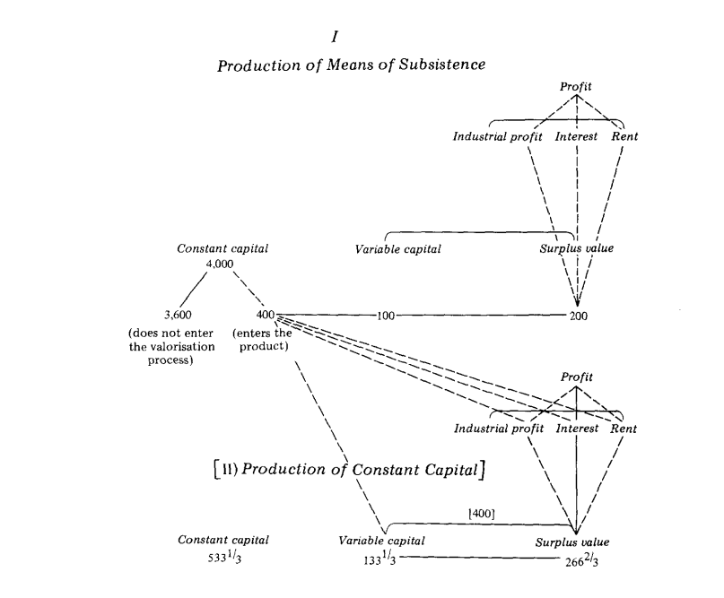 The variable capital of 133 1/3 is paid out in wages (money), and 133 1/3 is drawn with this money from the total product of class I. Thus 133 1/3 of the money of class II flows to class I, and products to the same value flow from class I to class II. The surplus value of 266 2/3 is paid in money as interest and rent, and a quantity of the products of class I is bought with this money. This sum of money together with the money that has flowed back from the wages, interest and rent of class I and the wages of class II is more than sufficient to provide class I with the 400 in money needed to replace class I's constant capital of 400 and to allow class II to draw means of subsistence from the total product of class I for its industrial profit. The result is that the whole of the product [of class] I has passed into the consumption fund, and 400 of the total product of class II has passed into class I in replacement of its constant capital, but class II, on the other hand, needs 533 1/3 for the replacement of its own constant capital.